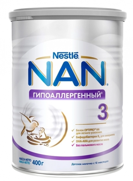 265292 СМЕСЬ СУХАЯ МОЛОЧНАЯ НАН «NAN 3 ГИПОАЛЛЕРГЕННЫЙ» банка жестяная 400 г, с 12 месяцев