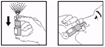 3. Вставити наконечник у одну ніздрю та 1 раз натиснути на дозуючий пристрій (рис. 2). Коли спрей вприснуто, обережно зробити вдих через ніс. Потім повторити процедуру, вставивши наконечник в іншу ніздрю.